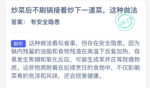软件提交 专题合集 热门手游炒菜后不刷锅接着炒下一道菜,这种做法?支付宝小鸡课堂新的一天答题开始啦!每天只需花一分钟,动动手指答对问题,180g饲料立马到账!2026年4月27日蚂蚁庄园的小鸡课堂题目正确答案是【有安全隐患】,炒菜后不刷锅直接炒下一道菜存在明显安全隐患,锅底残留的油脂、食物残渣会反复高温加热,易产生苯并芘等有害致癌物质,还会滋生细菌、发生氧化变质,同时残留调料会串味影响菜品口感,长期这样食用会加重身体代谢负担,危害身体健康。