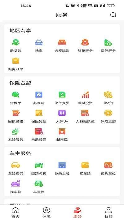 3、服务:提供地区专享、保险金融、车主服务、常用工具、大众生活、就诊服务、健康管理、养老金专区等服务