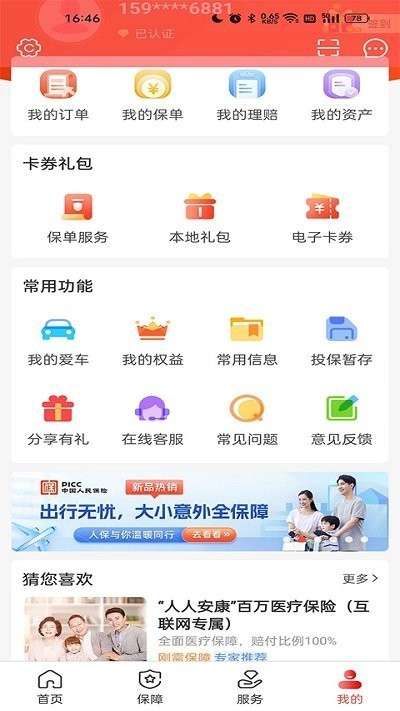 2、保障:健康险、意外险、财产险、人寿险、责任险、旅行险、家庭险的购买窗口,支持在线购买