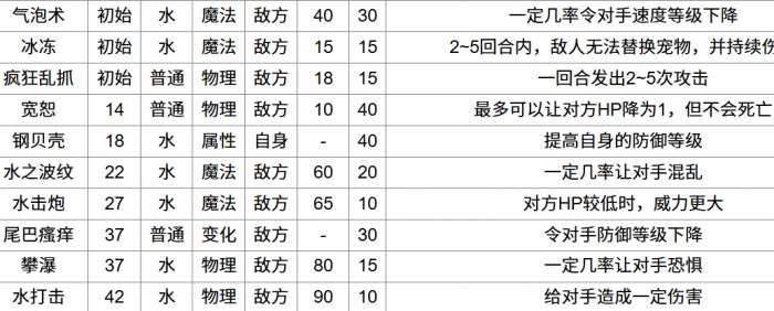 宽恕这个技能虽然是普通的物理攻击技能,这个技能最有一个关键的用处就能能够把对方的hp下降到1点,尾巴瘙痒则是能够使对方的防御等级下降,攀瀑会有一定的几率让玩家陷入到恐惧之中,水打击则能够给敌人造成90点的伤害,这一套技能主打的就是先降低敌方的防御和hp,让敌人陷入到恐惧在进行收割。