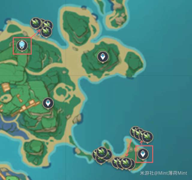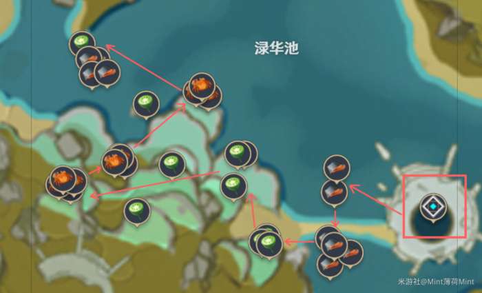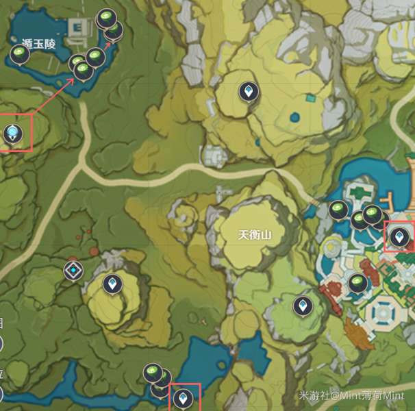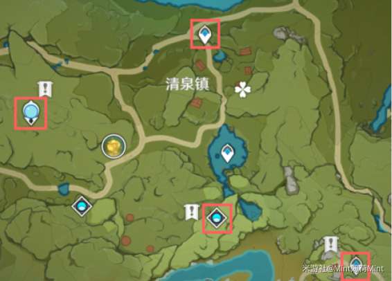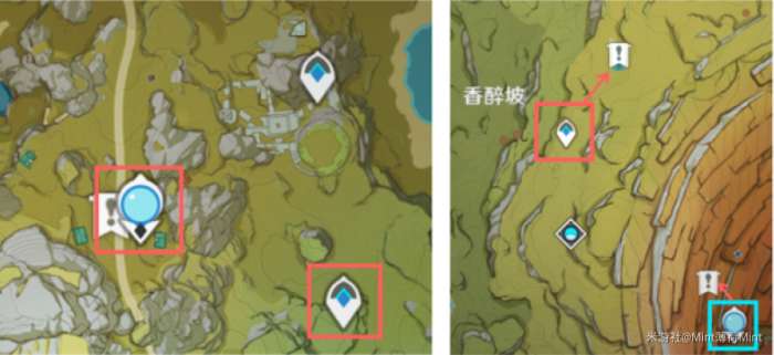 ↓锚点路线参考:四叶印至山顶旁赤鹫*1+鸟蛋*2→闲云e e e锁半山腰挖矿的丘丘人→再下一级山,小草扫枣椰*5和丘丘人,兰姐a重清怪→扫枣椰1+2