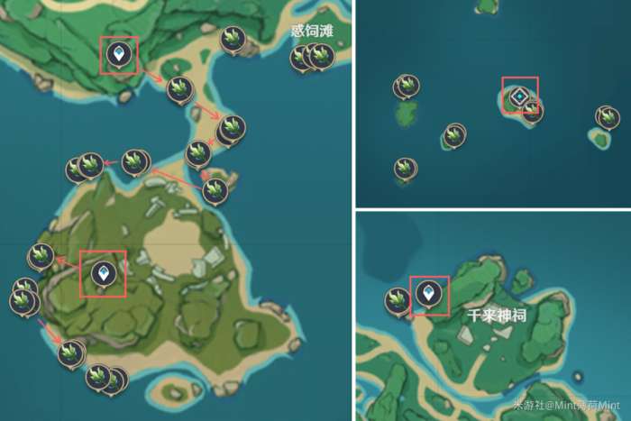 ↓锚点路线参考:小草原地扫鸟蛋*2+树莓*3(孔雀木*3)→视角转向菅名山,闲云ee e落至树莓旁→ee e至岩石上,小草扫海草*5→eee eee,小草扫海草*5+QQ人→打完再扫海草*2(丘丘人营地有锅子)