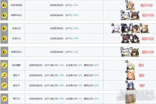 “砾+夜烟+斑点”的组合可以提供95%的生产力加成;“砾+夜烟+清流(2个贸易站)”的组合可以提供105%的生产力加成。因此,建议玩家尽可能将砾、斑点和清流升至一星精英化,以获得更高的生产力加成。