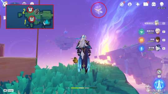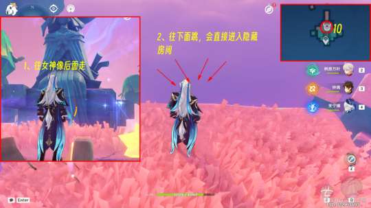 10.从6、7、8号的岛屿直往北飞,往北走。碰见女神像,继续往前走。来到悬崖这里,跳下去会变成光点一直飞到隐藏房间,下方第二张图标注位置处。