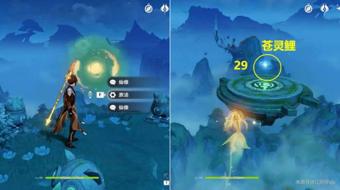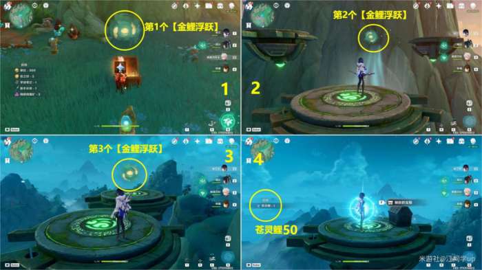 (3)将宝箱开了后,宝箱这里会出现一个【金鲤浮跃】,然后进入出现的【金鲤浮跃】在天上飞一圈后,最后会来到山顶空中的平台上,平台上有1个【苍灵鲤】