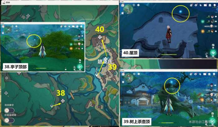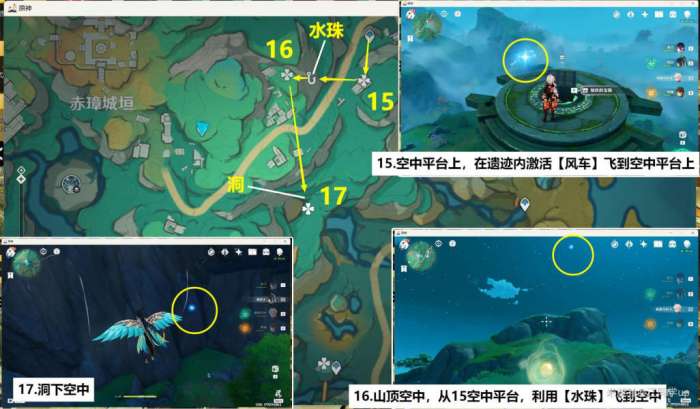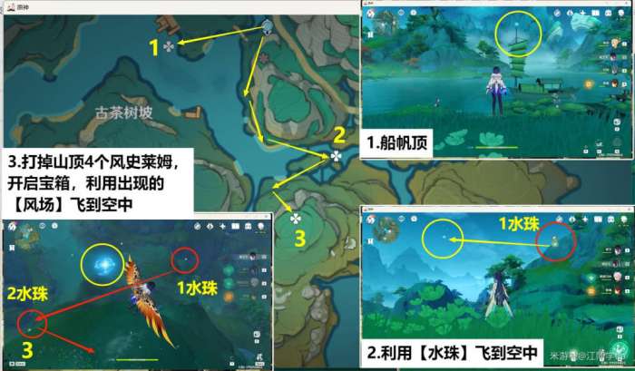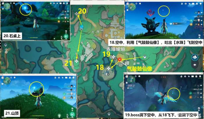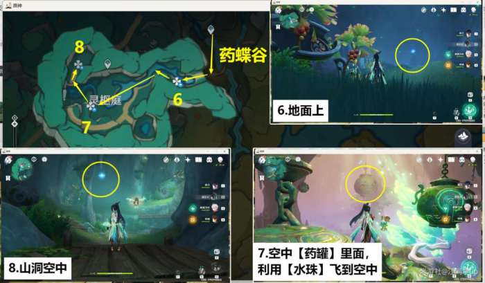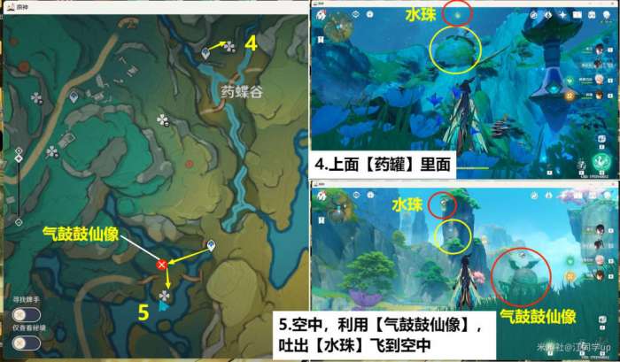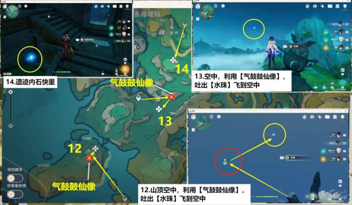 (2)首先需要解锁下图位置的宝箱,需要找回3个仙灵,其中2仙灵需要利用【气鼓鼓仙像】,吐出【水珠】飞到空中,然后去树顶靠近2仙灵,将2仙灵引导回去