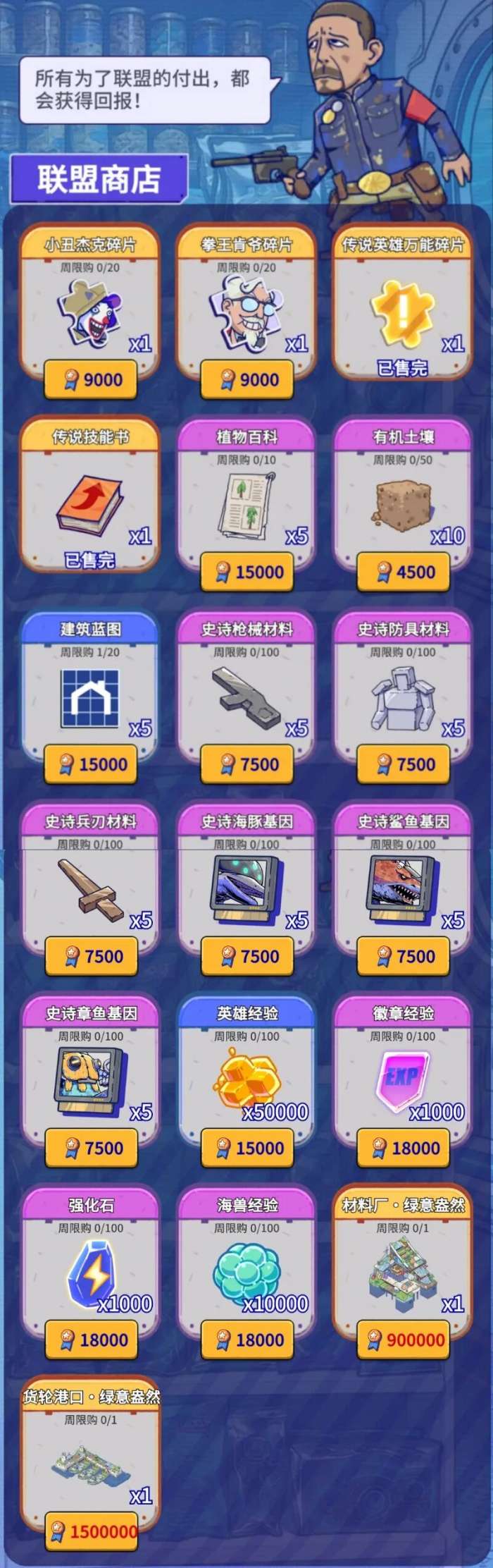 软件提交 专题合集 热门手游《疯狂水世界》联盟商店优先每周必换【传说万能碎片】与【传说技能书】。随后可积攒功勋,用以兑换底部两款价值68元的限定皮肤(S1赛季勤快即可白嫖)。其他如小丑等英雄碎片,若非培养目标则不推荐,植物百科与建筑蓝图可按需换取。