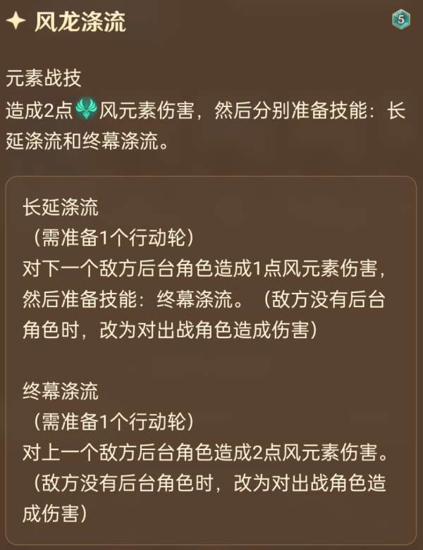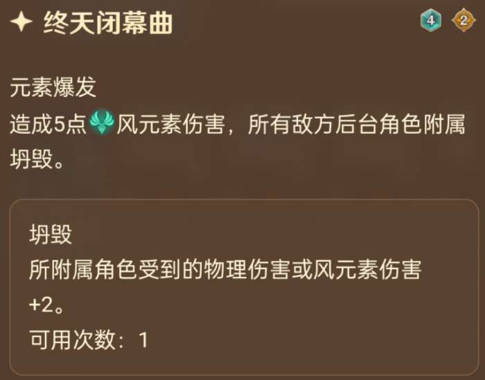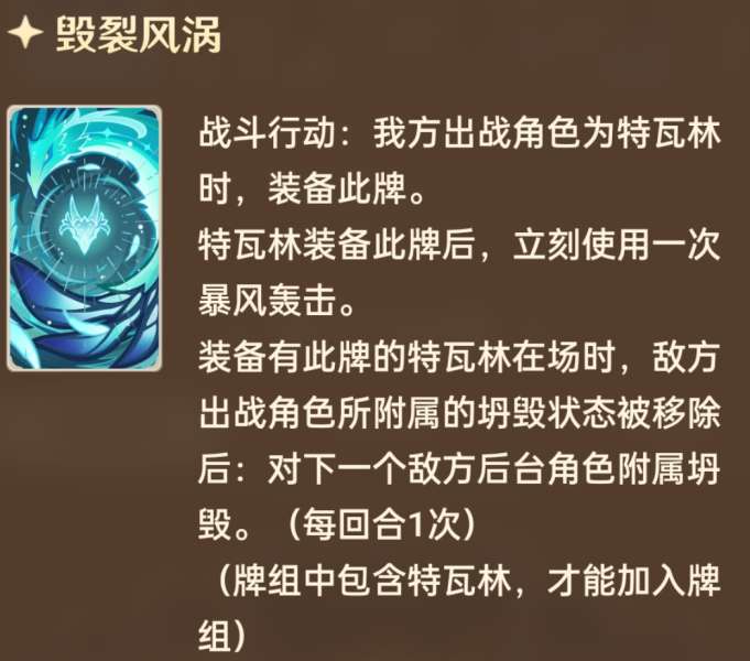 4费2充,和5费大E一起完美吃上风龙废墟,告诉你们谁才是风龙废墟主人。前台打5后台全部上2易伤理论就是打9,又是收益爆炸。所以特瓦林输出流程大概就像莫散一样,特瓦林在前台疯狂扩散输出,残局交给第三人收割就好。传统莫娜风三色优菈收割固然没问题,不过由于希望通过高伤害触发坍毁,所以风体系收割位或许也是不错的选择。说的就是你,琳妮特