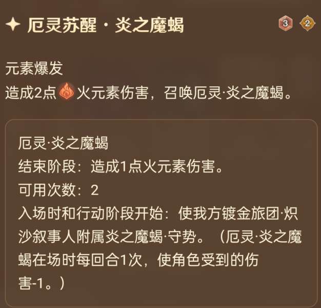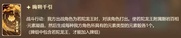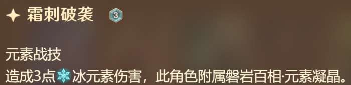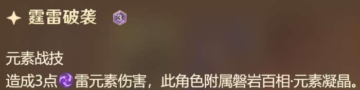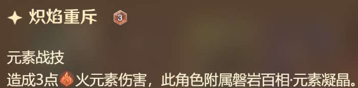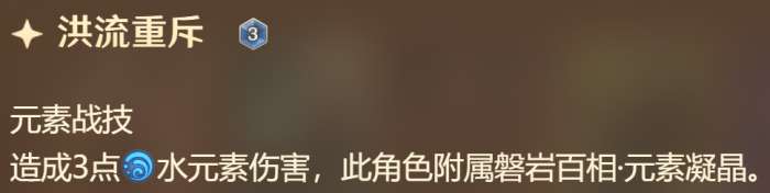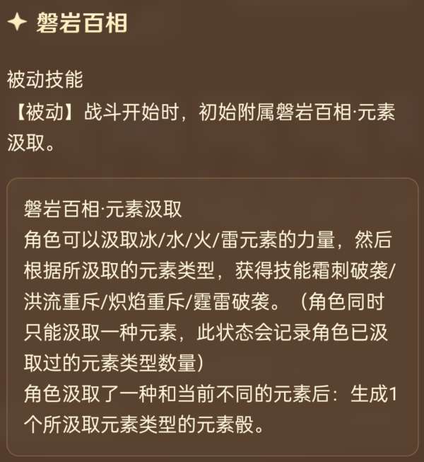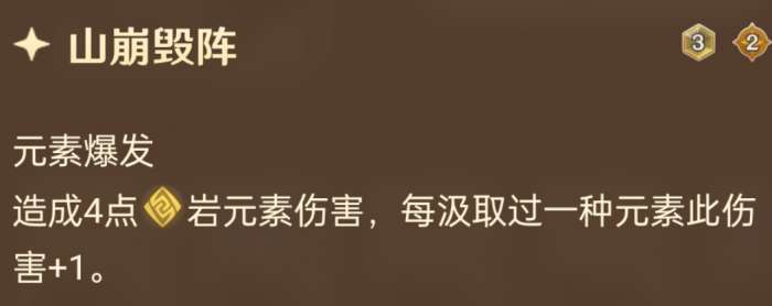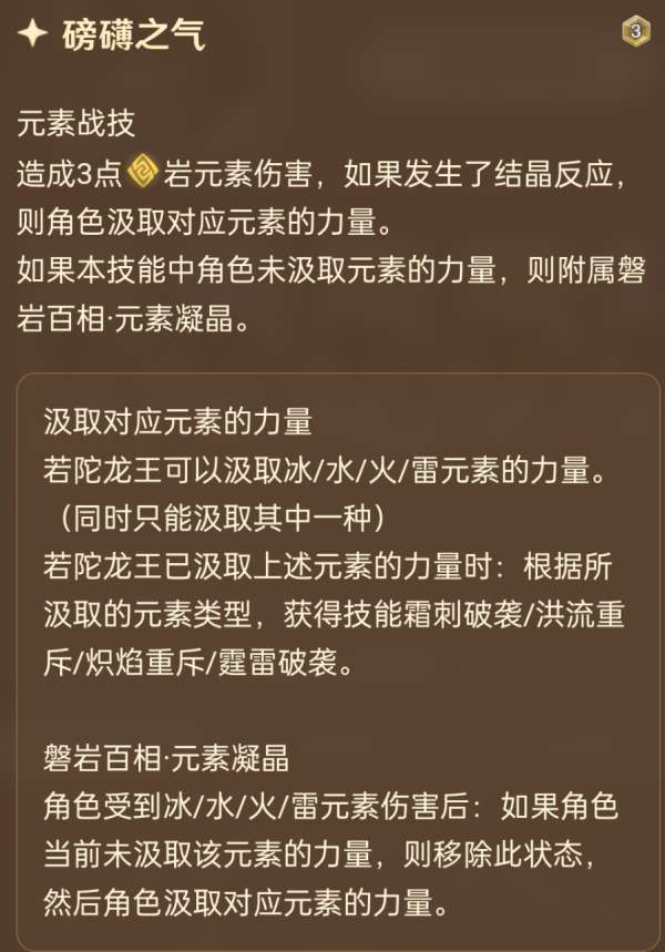 一开始只有3岩伤战技,汲取元素力量后,会额外多出一个元素战技,3费造成对应元素3点伤害。比如从雷属性变成冰属性之后,会失去3雷伤战技而获得3冰伤战技,而3岩伤战技永远存在。陀子哥理论上有4种形态可以变换,但不管怎么汲取始终都只能打出3伤战技,另外汲取新的元素能回一个骰子,在数值上占到不少便宜,另外真正厉害的地方还得看大招