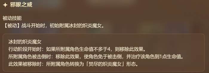 造成4点冰伤回2,立刻变身然后就能造成火伤,只有费用充足的时候才推荐这么打,因为提前变身很有可能是凭空少1血的因为本来可以复活嘛,不是很急着打火伤可以先不开这个大招让别人去输出。而火形态女士的大招是3费2充能打6火伤,没错,就是这么朴实无华的超模。如果带着大招变身那么充能点数还在,可以直接开启6火伤的大招,这在残局当中非常的强大。
