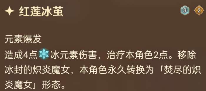 女士自带变身特性,变身后,元素战技造成的元素伤害变成火元素,其它效果不变。不考虑变身后的事,这个二段冰伤其实跟直接打三区别不会太大,实在是太容易规避了,除非吃到申鹤箓灵增伤的时候会有更大用处。所以说也不用太激动,女士还是强在变身特性上。
