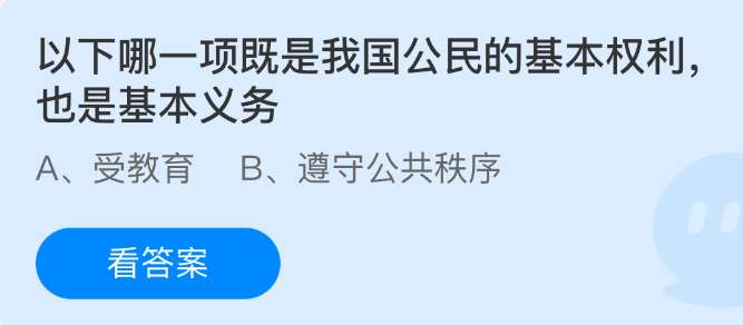 软件提交 专题合集 热门手游以下哪一项既是我国公民的基本权利,也是基本义务?支付宝小鸡课堂开课啦!每天花一分钟答题赚饲料,喂喂小鸡就能贡献爱心啦!轻松又意义十足!2025年12月4日蚂蚁庄园的小鸡课堂题目正确答案是【受教育】,《中华人民共和国宪法》第四十六条规定,中华人民共和国公民有受教育的权利和义务。
