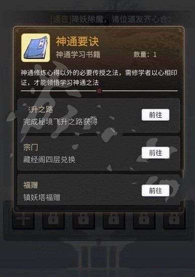 残篇通过宗门藏经阁兑换获得,神通心得通过镇妖塔获得。