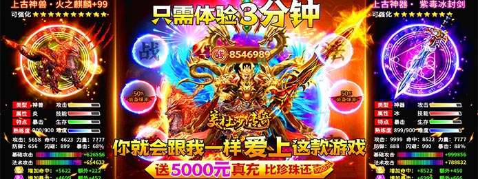 【美杜莎传奇】中天机老人送祝福,白送5000元充值卡,充值卡升级无限合成!上线赠送VIP30,100000钻石,100W元宝,登录送冰龙神兽,5分钟送白虎神兽,30级送火龙神兽,冰火两重天,神兽在线就能铺捉,收集神兽抢先兑换2千万钻石,独创一秒5刀,神龙降临,装备永久保值,钻石无限回收!