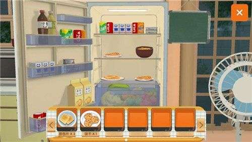 想要胡桃准时吃饭,必须在【冰箱】里投放各种料理(PS:简称投食),比如上图所示的面包片和饼干(PS:其他食物也可以)。等到饭点到来之后,胡桃就会自己取出来放到餐桌上食用了。