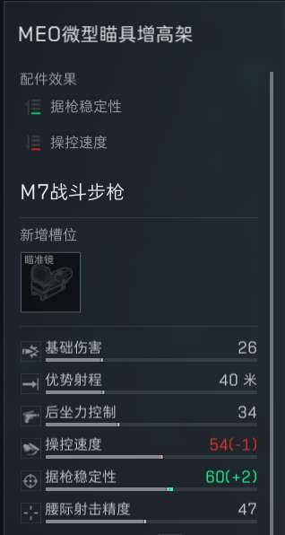 从属性上来说,表面上看【MEO微型瞄具增高架】的属性十分简单,它只是增加2点据枪稳定性,然后负面代价是-1操控速度。