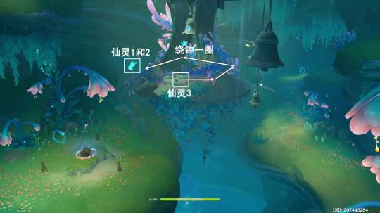 ▶按图中指引路线,指引仙灵3,绕空中的钟一圈;