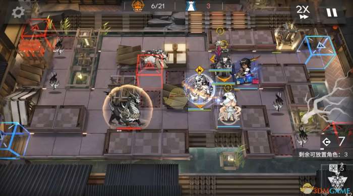 依次部署LGS(朝下)、棘刺(朝右)、小羊(朝右)、山,并适当补充医疗干员,避免损血过多。