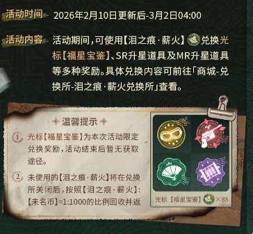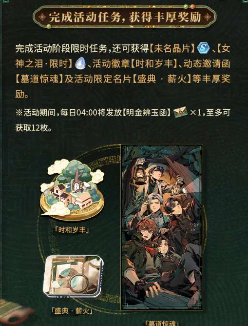 活动奖励体系覆盖全维度成长需求:完成委托可获得四位男主专属R级思绪卡;通关阶段剧情将解锁限定邀请函“墓道惊魂”;参与日常限时任务则可获取未名晶片、活动徽章【时和岁丰】、动态邀请函及限定名片等稀有资产。所有活动道具均支持在“薪火兑换所”内按需兑换,其中包括SR/MR角色升星关键材料“泪之痕·薪火”。