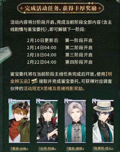 除卡池外,主线剧情活动“珍宝解密”同步开启。玩家需与四位调查伙伴协作,逐步揭开古籍珍宝背后的隐秘往事。活动全程采用分阶段开放模式:首阶段于2月10日版本更新后立即解锁,末阶段将于2月22日正式开放。每个阶段均配套独立主线章节与鉴宝委托任务,后者需在完成当期主线后,通过道具“明金辨玉函”接取并交付。