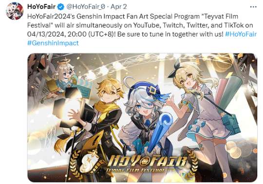 该图出自米家HoYoFair的外网推文,看来2024年的二创同人会马上就要开始了。本次的主题和枫丹电影节有关,预计会有很多优质的作品放出来。时间为4月13日20:00,预计B站会有转播。