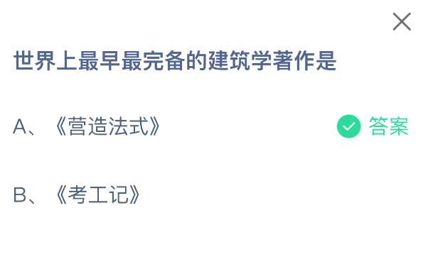 软件提交 专题合集 热门手游世界上最早最完备的建筑学著作是?这是支付宝蚂蚁庄园小鸡答题4月25日题目,支付宝小鸡答题是大家非常喜欢的活动,大家获取饲料就可以喂养小鸡领取更多的蛋去帮助更多的人了!今日正确答案是【《营造法式》】,《营造法式》是宋代李诫创作的建筑学著作,是世界上最早最完整的建筑技术书籍。