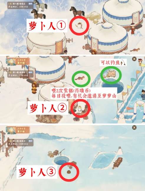 软件提交 专题合集 热门手游淞雪兆吉是桃源深处有人家游戏上线的全新主题活动,在「淞雪兆吉」活动首日剧情中,共有六个萝卜人等待寻找。其中,萝卜人四与五的位置可能需要玩家滑动屏幕或切换视角才能发现。参照位置示意图可快速完成收集。