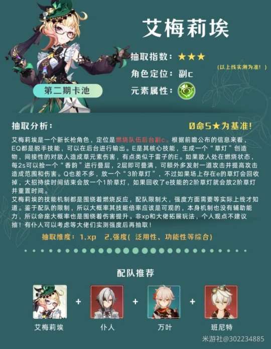 下半有一位新角色,很罕见的在三复刻的卡池中把新角色放到了下半,爱梅莉埃是燃烧特化角色,具体强度未知,等上线后做具体评测,夜兰是曾经的夜天后,虽然和水神赛道重合但二人都作为后台副c是完全不冲突的,仍然非常值得抽