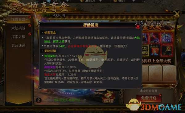 1、每日首次登录即可获得一次免费开启,之后抽奖需消耗盲盒抽奖卷,该道具可通过活动大陆挑战、探索之旅获得!