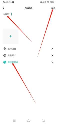 2、然后输入想要发布的内容,在选择想要发布的圈子,最后点击右上方“发送”,这样我们就能成功发布动态了。