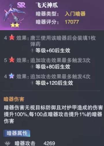 在这个游戏里,玩家可以使用的暗器很多,每一个都能起到不同的作用,飞天神爪是一个入门级别的暗器,可以让唐三使用,在等级提升了60级之后,使用这个暗器会自动装填弹药,等级提升到80级之后还能触发三次攻击效果,等级提升到120级之后可以触发四次追击效果,每一次攻击的时候能无视目标的防御,即便对方有护甲,也能给对方带来大量的伤害,每一次进行攻击,还能提升1%的暗器伤害。
