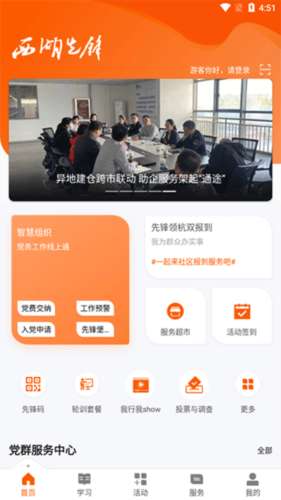 软件提交 专题合集 热门手游西湖先锋app首页能查看每日推荐资讯、缴纳党费、申请入党、活动签到等;学习界面可查看热门课程与听书榜,学习外语及了解杭州历史;活动界面能搜索线上线下党建服务;服务界面提供智慧组织、云上服务等功能;还可通过“我的”页面修改个人资料、进行账号设置等操作。
