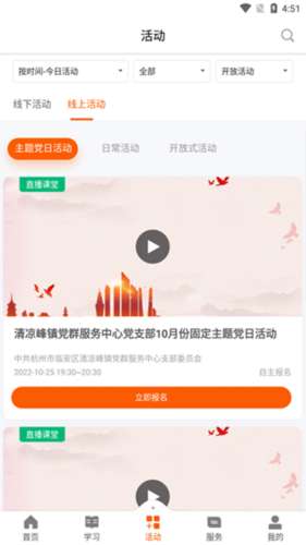 3、活动界面会显示有关党建的线上和线下服务,可根据时间搜索,或者根据活动主题搜索