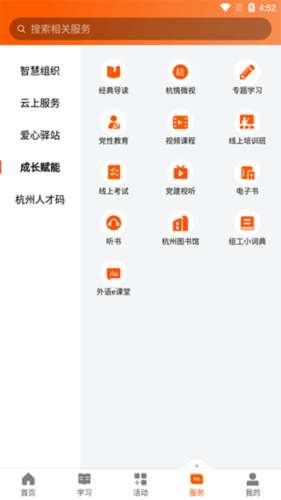 4、服务界面提供智慧组织,云上服务,爱心驿站,成长赋能,杭州人才码功能