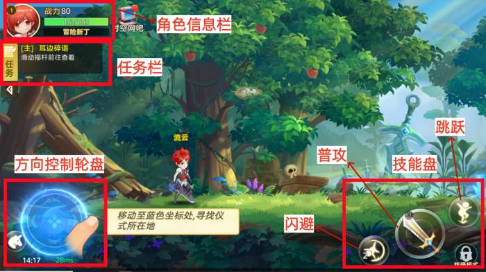 1、创建好角色后就可以进入游戏开始冒险啦!根据新手引导,操作角色至引导位置,界面的基本分布信息翠西已经为大家标注出来啦,是不是很贴心呢!