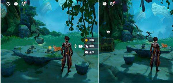 2、来到下图的黄圈位置,在石桌面前选择“放置”,将“古老的玉盏”放上进行“品茗”解锁宝箱。