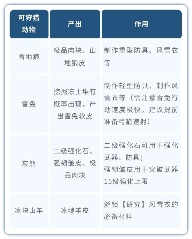 其他:利用火把、篝火御寒,注意当雪原出现暴风雪时,无法正常生火,建议搭建简易遮雪鹏来生火保暖