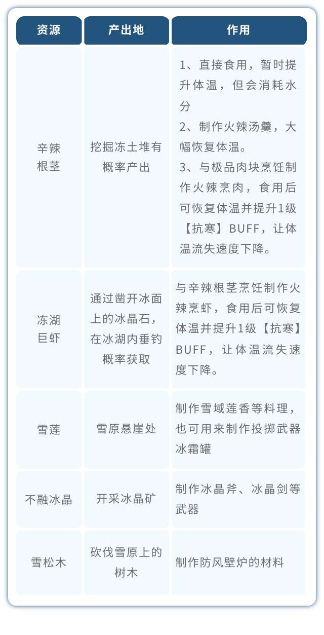 注意点:低温区域内燃料的消耗速度会大幅加快,燃料在雪原地区较难获取,取暖后记得熄灭篝火哦!