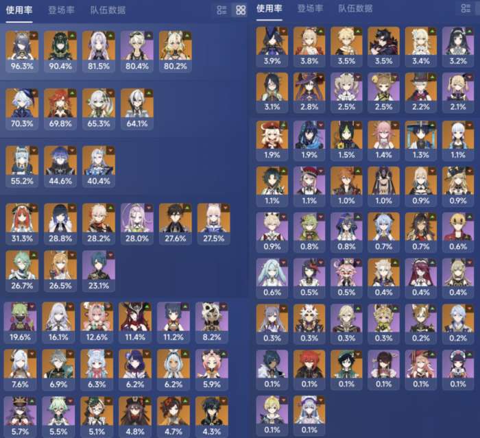 废话不多说,具体大家直接看上图,就最新一期深渊数据来看,角色使用率排名第一的是菈乌玛,使用率高达96.3%,遥遥领先其他角色。