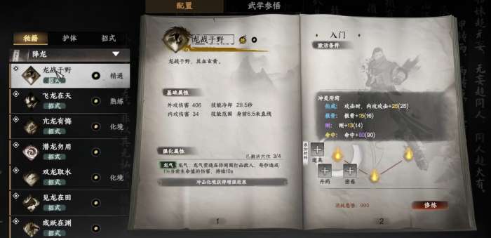 下面说说关于降龙十八掌的连招问题。每一个连招的第一招都是至关重要的,尤其是在冲脉时,我们需要确保第一招能够给敌人造成最大的伤害。在选择连招时,通常需要选择伤害最高的武功放在第一招,并对其进行冲脉强化。比如“龙战于野”,它的外功伤害极为可观,搭配刚属性的提升后,打出的每一击都异常强劲。对于连招的第二招,推荐选择“亢龙有悔”这样威力强大的招式,以确保在连招中断的情况下,仍能发挥出极高的输出。
