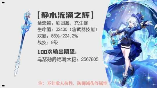 芙宁娜使用【静水流涌之辉】+剧团套圣遗物,主词条选择“充生暴”,生命值32430(含武器技能),双暴85%/224.2%。