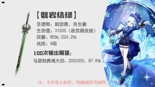 芙宁娜使用【磐岩结绿】+剧团套圣遗物,主词条选择“充生暴”,生命值31205,双暴调整配平后依旧保持85%/224.2%。