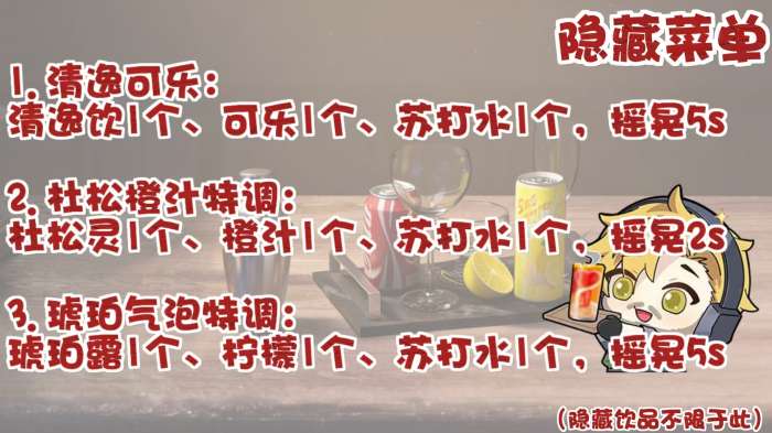 除了上述介绍到的9款应用价值非常高的饮品之外,兔桑还整理了几个非常稀有、值得珍藏的饮品配方——隐藏饮品当然不仅仅只有这些,没有介绍到的制作配料表就需要各位彦祖和亦菲来补充了!