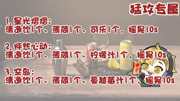 ②“怦然心动”需要清逸饮1个、薄荷1个、柠檬汁1个,摇晃10s;
