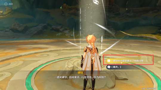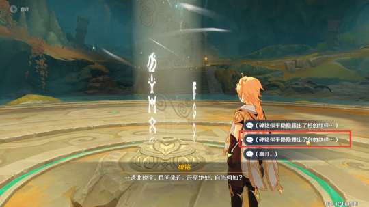 10,然后来到祭台中间调查碑铭,选择【露出剑的纹样】。