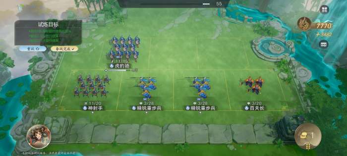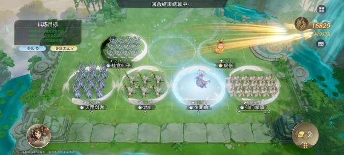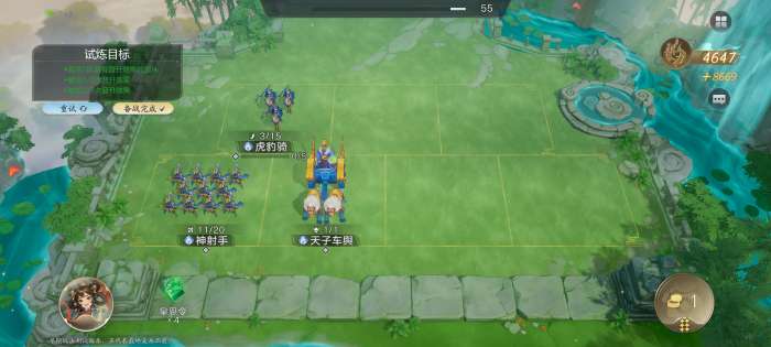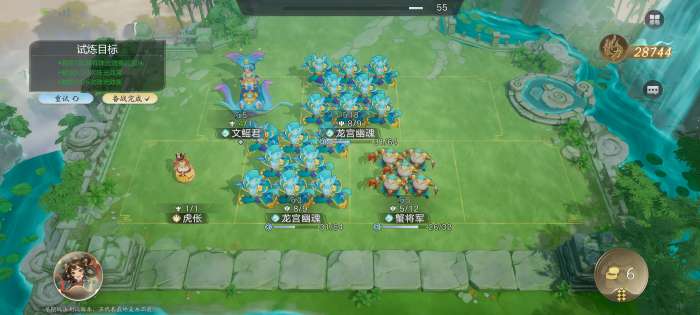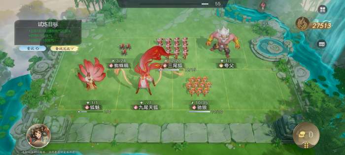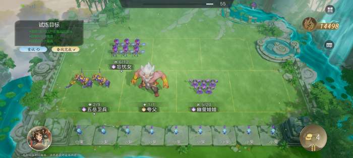 这关主要是靠触发天子车舆的回合结束效果,先上左边四个,然后上虎怅,狰妖,就完成了