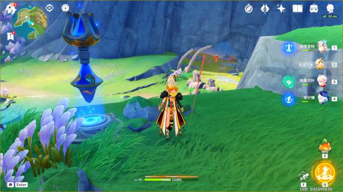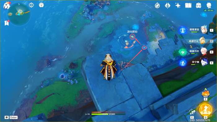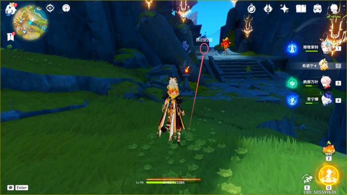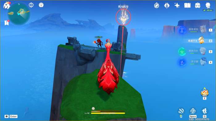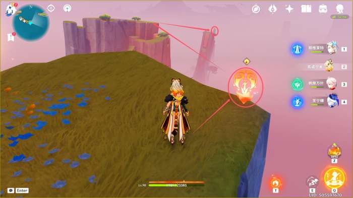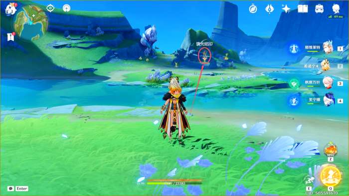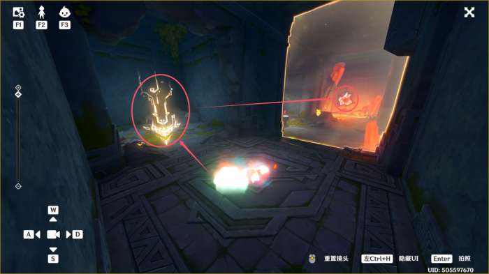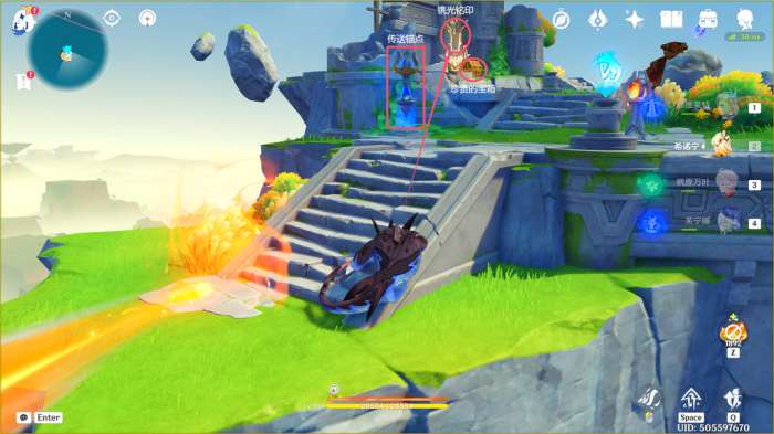 过完剧情后,我们直接跳到升起来的平台上,再在平台上跳到空中触碰第一个「镌光铭印」,传送离开这里(传送离开这里后,会自动激活一个传送锚点)