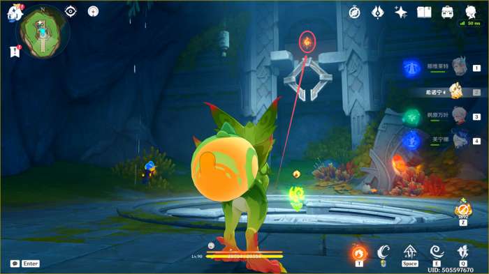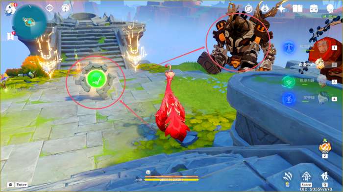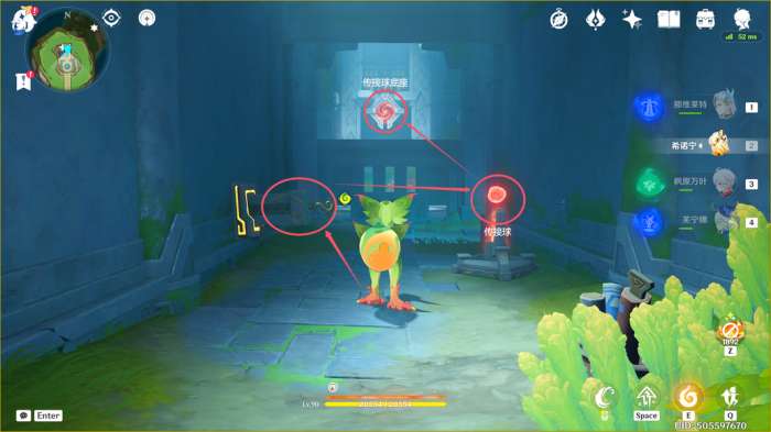 来到里面后,我们接着拉动机关,在石门开启时,利用匿叶龙的能力,将红色「传接球」收取,然后出去;之后我们长按E,对准红色「传接球底座」松开,将收取的红色「传接球」射出去