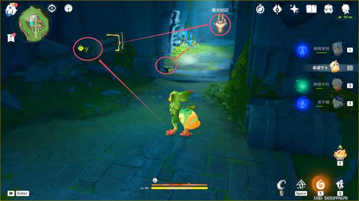 来到此处后,我们先将秘源机兵解决掉;接着触碰出现的第二个「镌光铭印」,跟随着它往下飞(同时,我们获得一个精致的宝箱;注意!「镌光铭印」在空中会暂停一次,需要我们靠近触碰)
