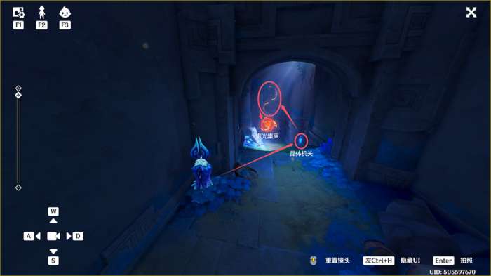 来到此处后,我们先攻击「晶体机关」;接着利用暝视龙的能力,激活「刻录环」中的力量,打开其后方大门;之后从上方跳进去,将「镌光集束」关闭,即可搭乘升降梯下去(攻击完「晶体机关」后,激活「刻录环」的速度要快;搭乘升降梯下去时,中途有一个普通的宝箱可以顺手开启)